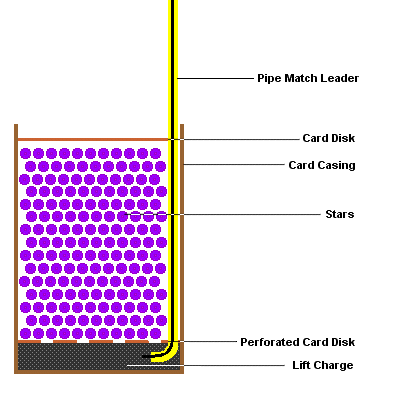 A mine consists of a tubular, card casing with a lift charge at the bottom. There is a perforated card disk separating the lift charge from the 'body' of the mine which is packed with stars and/or effects. (Whistles, Hummers, Reports, Etc.)