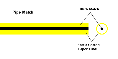 Pipe Match consists of a Black Match 'core' which is encased in a loose fitting paper tube or 'pipe'. The paper tube is often coated in wax or plastic to make it damp resistant. Pipe Match burns quickly (Approx. 65 Ft/Sec.) and is used for fusing together fireworks that need to start at the same time and for transfering fire from an igniter to PIC.
